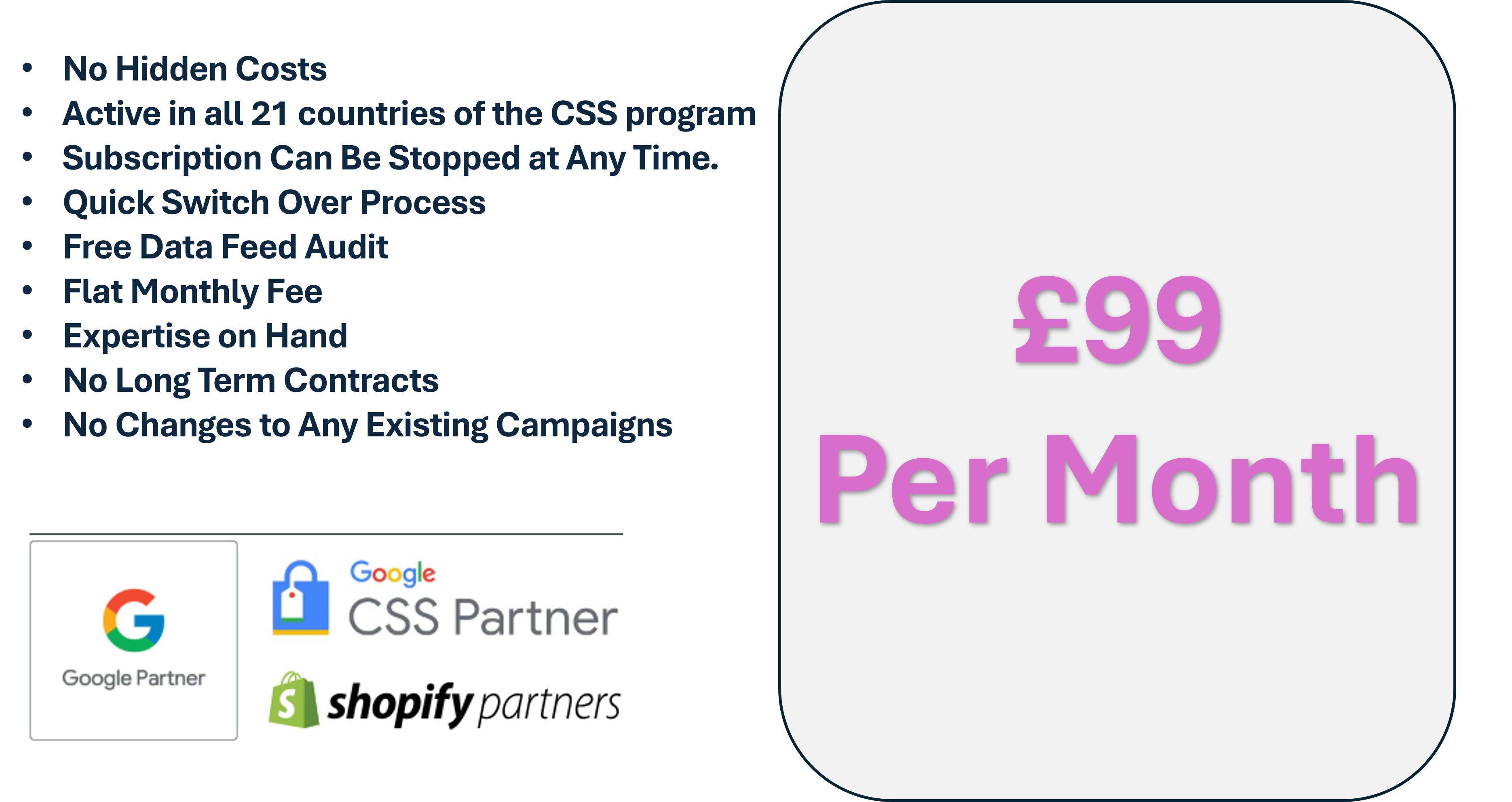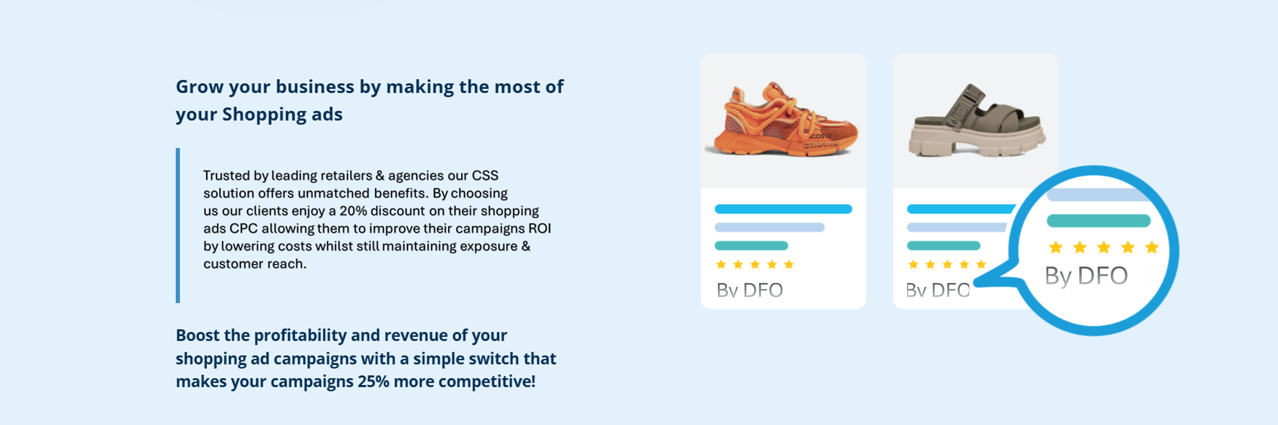 Switching to our Google CSS partnership is quick and effortless, taking just 5-10 minutes of your time. Enjoy an exclusive 20% discount on your Shopping Ads CPC while maintaining campaign continuity and quality score.